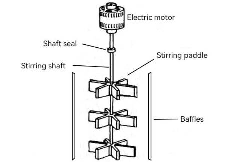 The motor and gearbox are to provide power for stirring; the stirring paddle and stirring shaft are the main parts of the operation; the shaft seal is to prevent the fermentation liquid from leaking out and contamination by stray bacteria; the baffle is to prevent large vortex on the liquid surface during stirring and promote the mixing of liquid in the tank.