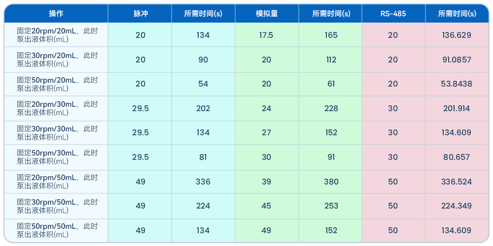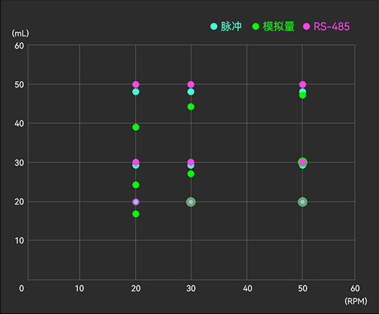 从表中数据可以看出,一旦改变了转速和泵出量,不同的驱动方式控制的蠕动泵会有不同结果。3种驱动方式中,RS-485通讯方式的控制精度最优,脉冲次之,模拟量的误差最大。