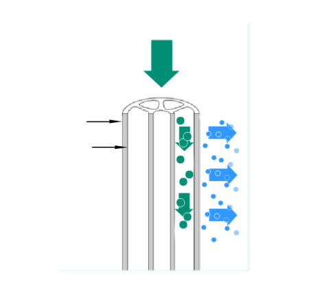 与硅藻土过滤相比,膜过滤主要是一种表面错流过滤。固形物被截留在膜表面或膜的孔隙中。当产品以一定的流速流经膜表面时,这些固形物被冲走并保持悬浮状态,因此膜表面保持干净、有效。运行一定时间后膜慢慢被堵塞,这时候必须进行化学清洗。需要过滤的产品流经膜的通道:部分液体透过膜成为滤液(2),而截留液(1)继续流动。